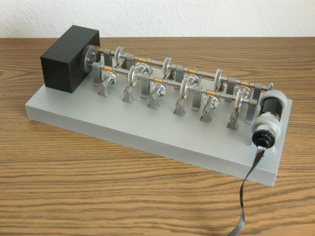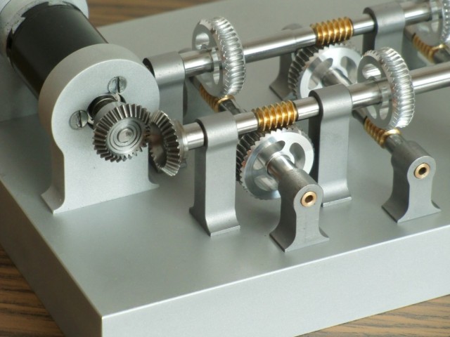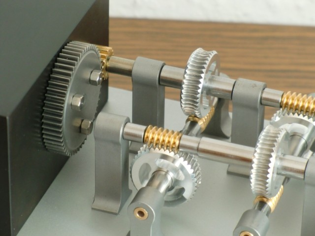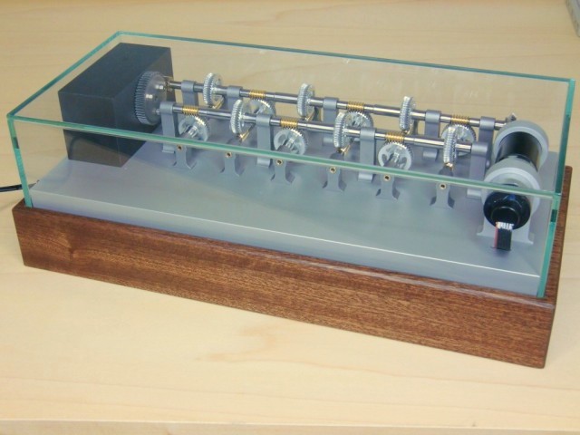 Statt des Granitbrockens habe ich für das letzte Zahnrad einen Stahlklotz verwendet. Der Motor bringt am Eingang 60U/min, dann wird jeweils mit 1:40 untersetzt. Da das eine Weile dauert, das ganze Getriebe in der Zeit einstauben würde, hat mir Rainer Isbitzki eine sehr sauber gearbeitete Glasabdeckung gebaut. |