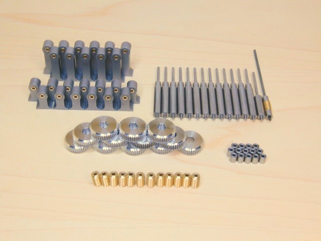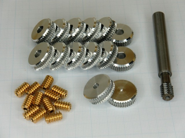 Das sind die fertigen Zahnräder aus Aluminium, zusammen mit dem Werkzeug, dem Gear-Cutter und den Messingschnecken. Dazu noch ein paar Lagerböcke und Wellen und der Zusammenbau kann beginnen. |
