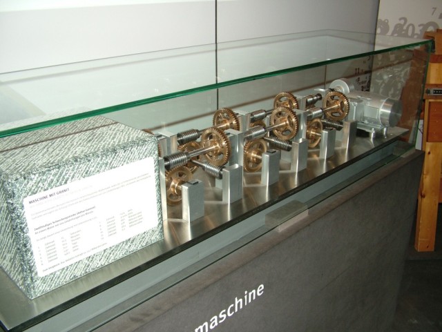 Beim Besuch des Industriemuseums Chemnitz sah ich ein schönes Modell der Unendlichkeitsmaschine. Es handelt sich dabei um ein mehrstufiges Getriebe, bei dem die Bewegung der Zahnräder schon nach der dritten Stufe nicht mehr wahrnehmbar ist. Die Maschine mit Granit, in dem ist das letzte Zahnrad eingebettet, warum wohl? |
