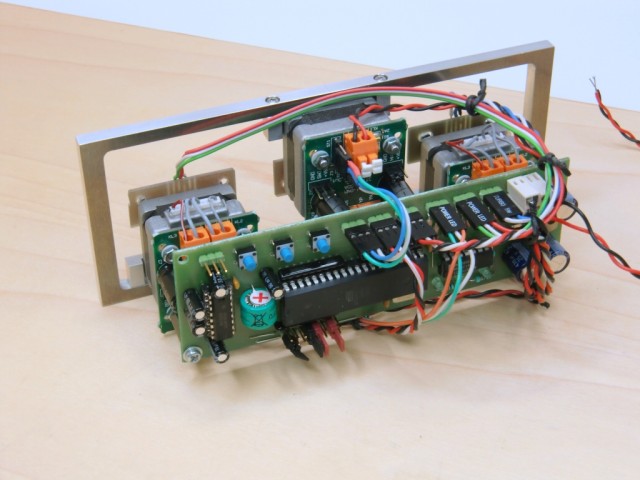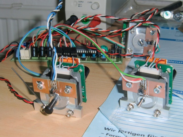 Inzwischen habe ich Gefallen an ausgefallenen Uhren gefunden. Eine Uhr, bei der die Zeiger von Schrittmotoren angetrieben werden, dazu ein etwas ausgefallenes Design des Zifferblatts sollte das nächste Projekt werden. Geeignete Schrittmotoren bekommt man bei Pollin recht billig, die Ansteuerung erfolgt über Endstufen von ELV. Die Software dafür hat ein Kollege aus der CNC-Ecke geschrieben und auch das Layout der Leiterplatte erledigt. So konnte ich ich auf die reinen mechanischen Arbeiten beschränken, Halterungen für die Motoren, Hebel für die Lichtschranken, Zeiger und Gehäuseteile. |