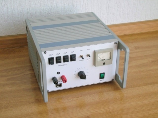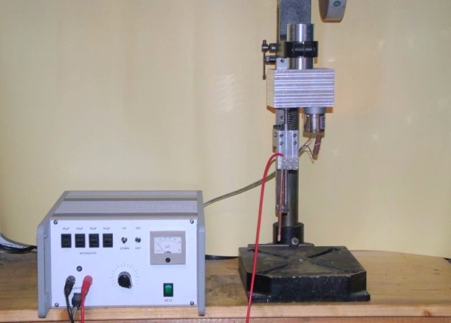 Aus einem einfachen Gleichspannungsnetzteil werden Kondensatoren deren Kapazität wählbar ist aufgeladen. Die Entladung findet beim Berühren des Werkstücks mit der Elektrode statt. In diesem Moment wird die Elektrode durch einen Motor zurückgezogen und die Kondensatoren werden erneut geladen. Der Motor fährt nun elektronisch gesteuert die Elektrode wieder zum Werkstück und der Vorgang beginnt von vorn. |