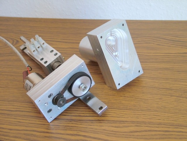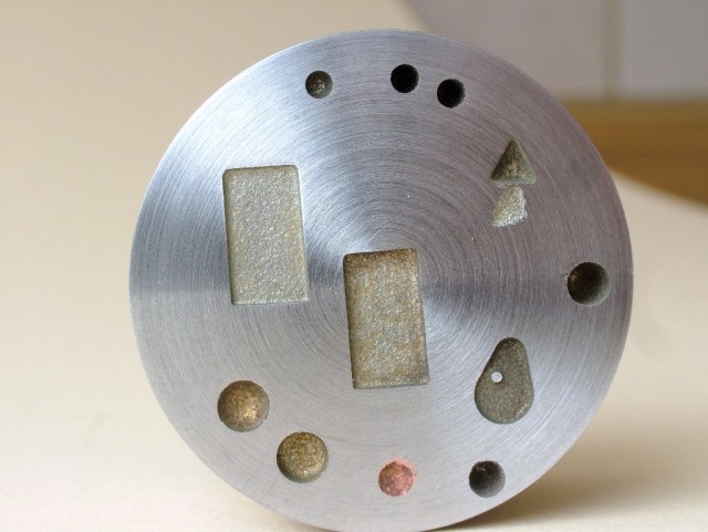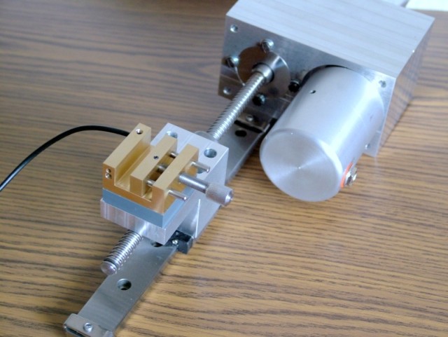 Die Führung der Elektrode erfolgt mit einer kleinen Linaerführung, angetrieben von einem Getriebemotor über eine Kugelgewindespindel. Diese einfache Mechanik kann in einem Bohrmaschinenständer oder der Fräsmaschine eingespannt werden. Das Testwerkstück zeigt das Ergebnis mit unterschiedlichen Elektrodenmaterialien wie Grafit, Kupfer Messing und Hartmetall. Nach längeren Versuchen hat sich jedoch eine Wolframelektrode und destilliertes Wasser als Erodierflüssigkeit als sehr gut geeignet erwiesen. Gewindebohrer ist seit der Fertigstellung des Erodiergerätes nur ein einziger abgerissen, der konnte aber sehr gut entfernt werden |