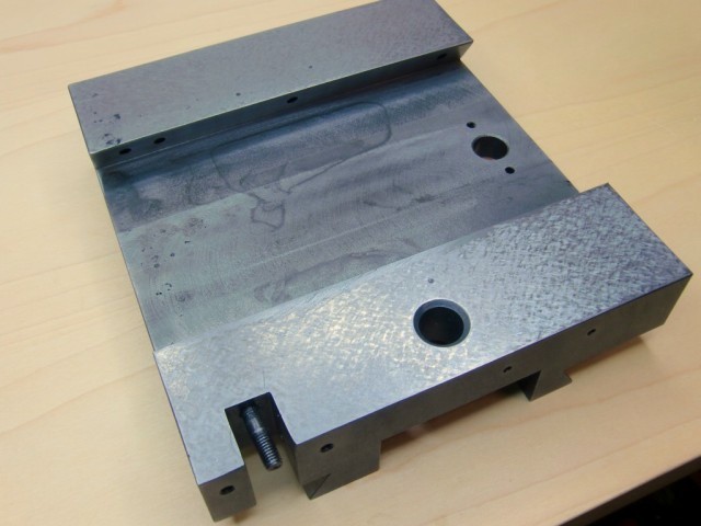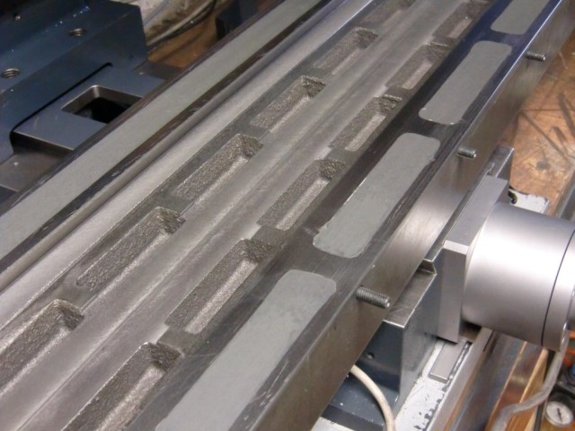 Der Verschleiß an den Führungen wird langsam sichtbar, damit auch die Ungenauigkeiten am Kreuztisch. Ich habe ihn neu geschabt damit die ganze Fläche trägt und nicht nur eine Kante und eine Ecke. Der Nutentisch hat auf der Unterseite in der Lauffläche mehrere Kammern, wozu auch immer. Dadurch nutz sich die Gegenseite ungleich ab. Diese Hohlräume wurden mit passenden Metalleinlagen und Multimetall gefüllt und oben mit Moglice beschichtet und ebenfalls neu geschabt. Der Tisch läuft jetzt wesentlich leichter und gleichmäßiger. |