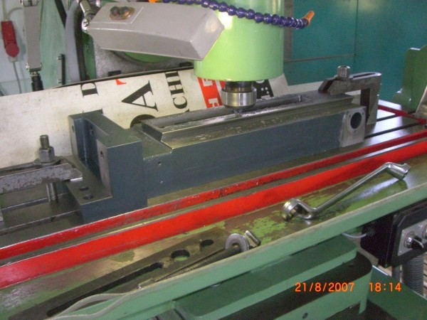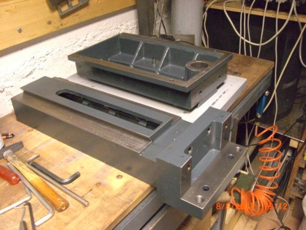 Zuerst mal muss alles zerlegt werden, denn der Austausch der der Trapezgewindespindeln gegen Kugelgewindespindeln erfordert ein paar Änderungen an den Maschinenteilen. Da ist man froh, wenn man aus der CNC-Ecke Hilfe angeboten bekommt. Da liegt dann die Säule der Maschine auf einer "richtigen" Fräse, sorgfältigst ausgerichtet und es wird Platz geschaffen für die KG-Mutter. |