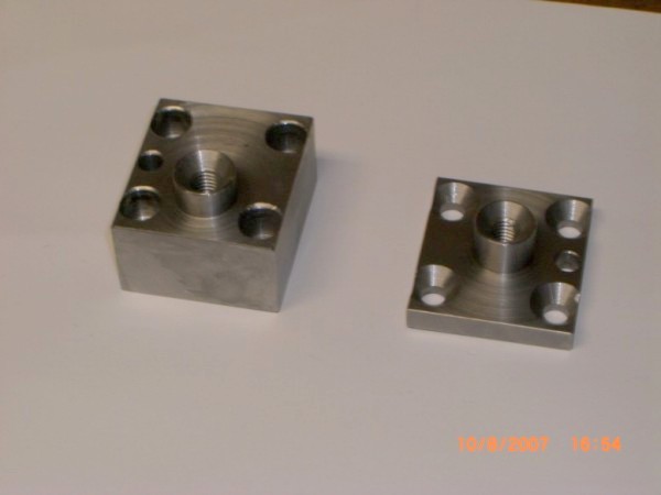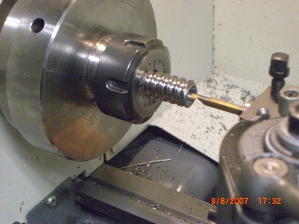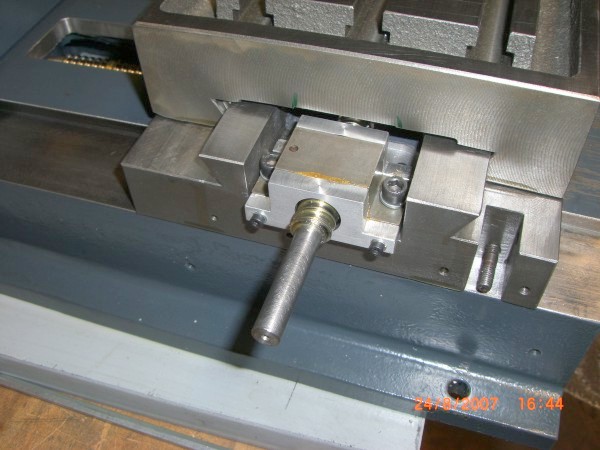 Die KG-Spindeln müssen an den Enden bearbeite werden, ich habe die aufgebohrt und ausgedreht. Die Endstücke der Originalspindeln habe ich dann eingeklebt. Später sollte sich zeigen, dass diese Lösung nicht zufriedenstellend arbeitet. Die Klebestelle hält, aber Vorspannung der Festlager lässt sich nicht einstellen, weil diese gegen das Zahnriemenrad verspannt werden, dort aber die Spannbuchse der Kraft nicht standhält. Adapter für die KG-Muttern sind notwendig, da die Abstände zwischen Mutter und Maschine nicht mehr stimmen. |