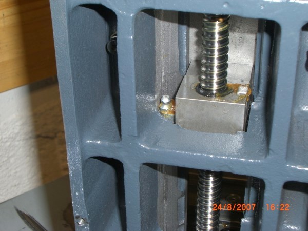 Es geht schon recht eng zu, ohne Ausfräsungen an den Maschinenteilen hätten die neuen Spindeln gar keinen Platz. Für die KG-Mutter der X-Achse bietet Isel keine Abstreifer an, man kann diese aber selbst nachrüsten, wenn man sich ein Paar Halter macht. Die Originalmutter habe ich für die Befestigungsschrauben an den entsprechenden Stellen angebohrt und Gewindebuchsen eingeklebt. |